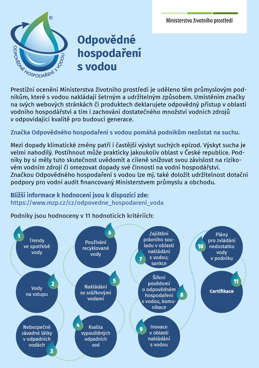 Na základě zpravování Vodního auditu lze od Ministerstva životního prostředí získat značku Odpovědného hospodaření s vodou (OHV). "Na základě odborného hodnocení získají značku OHV organizace, které dobře hospodaří s vodou ve smyslu ekonomickém a environmentálním, a to jak uvnitř vlastní organizace, tak zároveň svým přístupem a působením navenek, čímž uplatňují principy společenské odpovědnosti v oblasti nakládání s vodou."